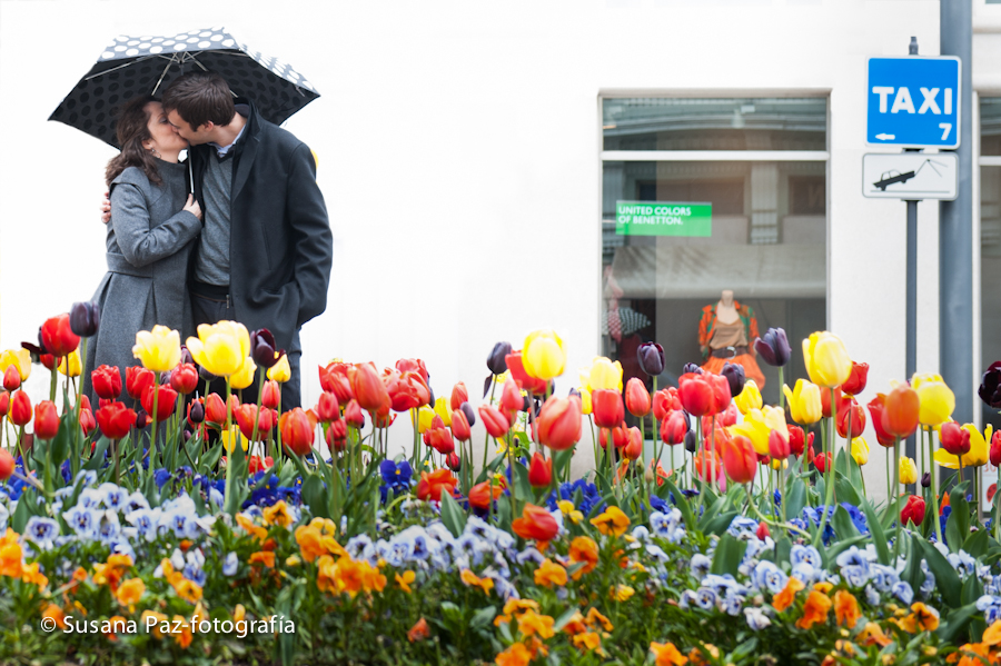 Érase una vez una ciudad en la que hace mucho frío y en invierno llueve tanto que las piedras se llenan de flores y rezuman humedad y vida. Lugo es la ciudad amurallada de Galicia, la más antigua, misteriosa y llena de historia, con un color especial y una luz esquiva que se filtra entre los muros de piedra y las señoriales plazas. Hacia allí nos fuimos una tarde de marzo con la intención de hacer la preboda de Maria José y Miguel; y reconozco que fue toda una temeridad por nuestra parte. Durante todo el trayecto nos acompañó la lluvia y en el horizonte ni siquiera un claro de esperanza. Las opciones eran dos: posponer la sesión para otro día o arriesgarnos a fotografiar bajo la lluvia. Elegimos la segunda y decidimos pensar en positivo. San Pedro, que todo lo sabe, esta vez nos premió con intervalos de lluvia y sol, de modo que pudimos recorrer Lugo con la ayuda de otros dos protagonistas olvidados en esta sesión: Los paraguas de Maria José y Miguel.